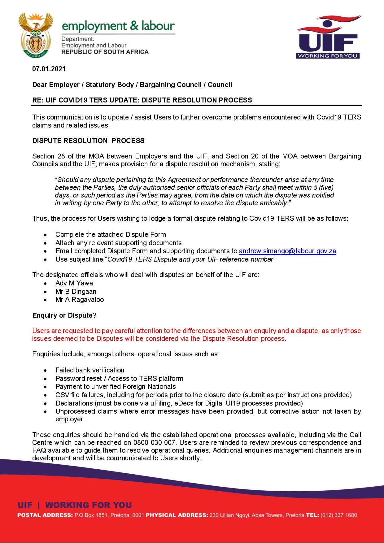 Unemployment Insurance Fund Uif On Twitter Dear Employers Statutory Bodies And Bargaining Councils Please Read The Below Covid19ters Dispute Resolution Letter The Dispute Form Is Available For Download Here Https T Co 7mpa39o0ef Https T